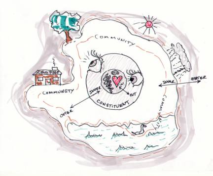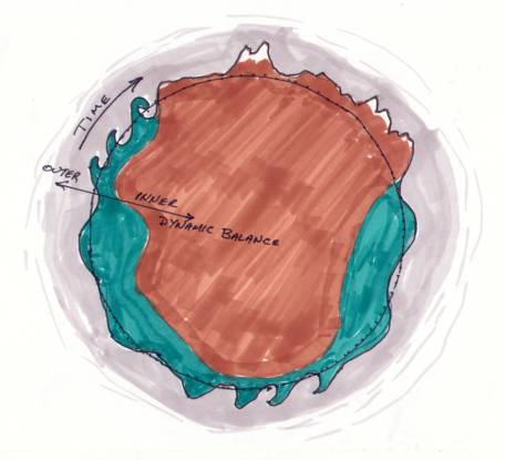 Inquiry: Outwards-and-back-in-again simultaneous with inwards-and-back-out-again. (assertive-action is recognized to be simultaneously, reciprocally related to dynamical shape of opportunity-to-act, through the mediating actions of the containing space).